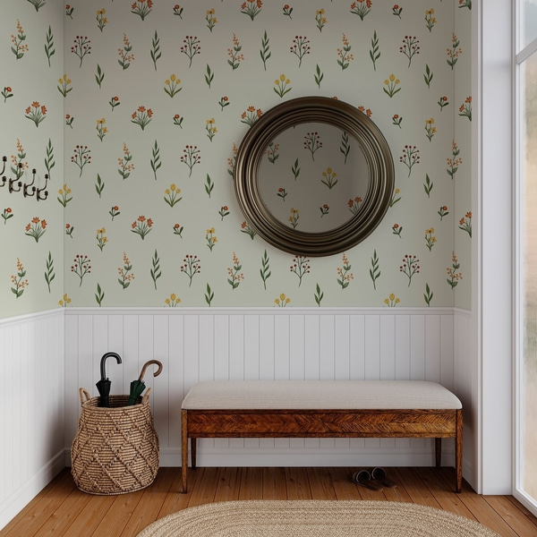 Flores y mariposas en tonos pastel sobre fondo crema.