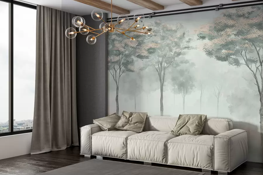 Altos pinos texturizados en un bosque brumoso, con una atmósfera neblinosa y brumosa