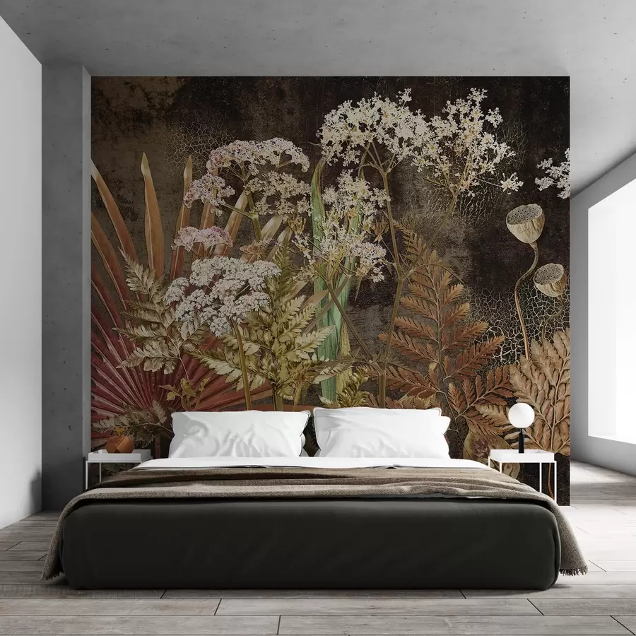 Un arreglo floral con flores grandes de colores suaves y textura, en tonos burdeos, melocotón y blanco, con hojas delicadas