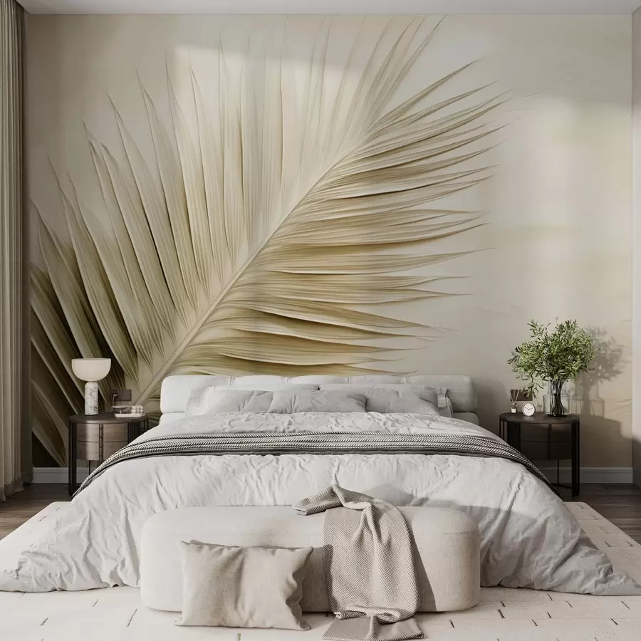 Hoja de palmera beige sobre fondo de textura suave