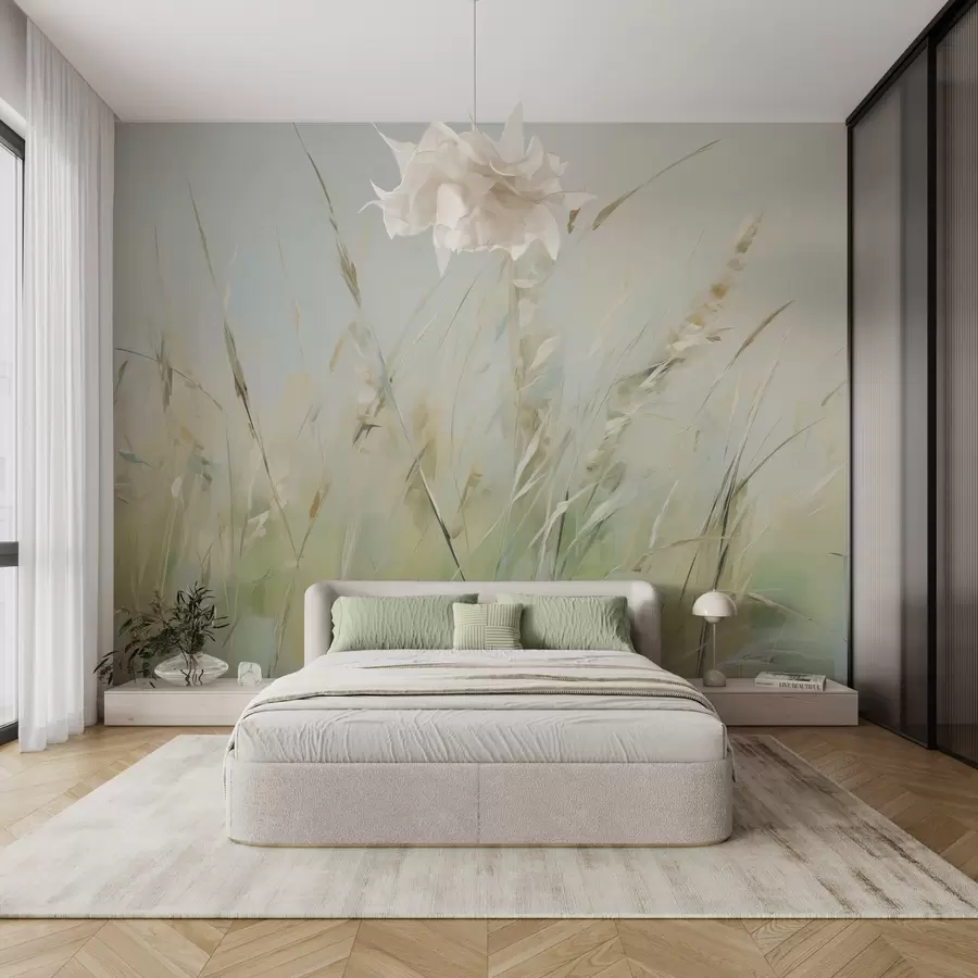 Paisaje tranquilo y texturizado con hierbas altas y aguas tranquilas, suaves colores pastel, árboles lejanos en el horizonte