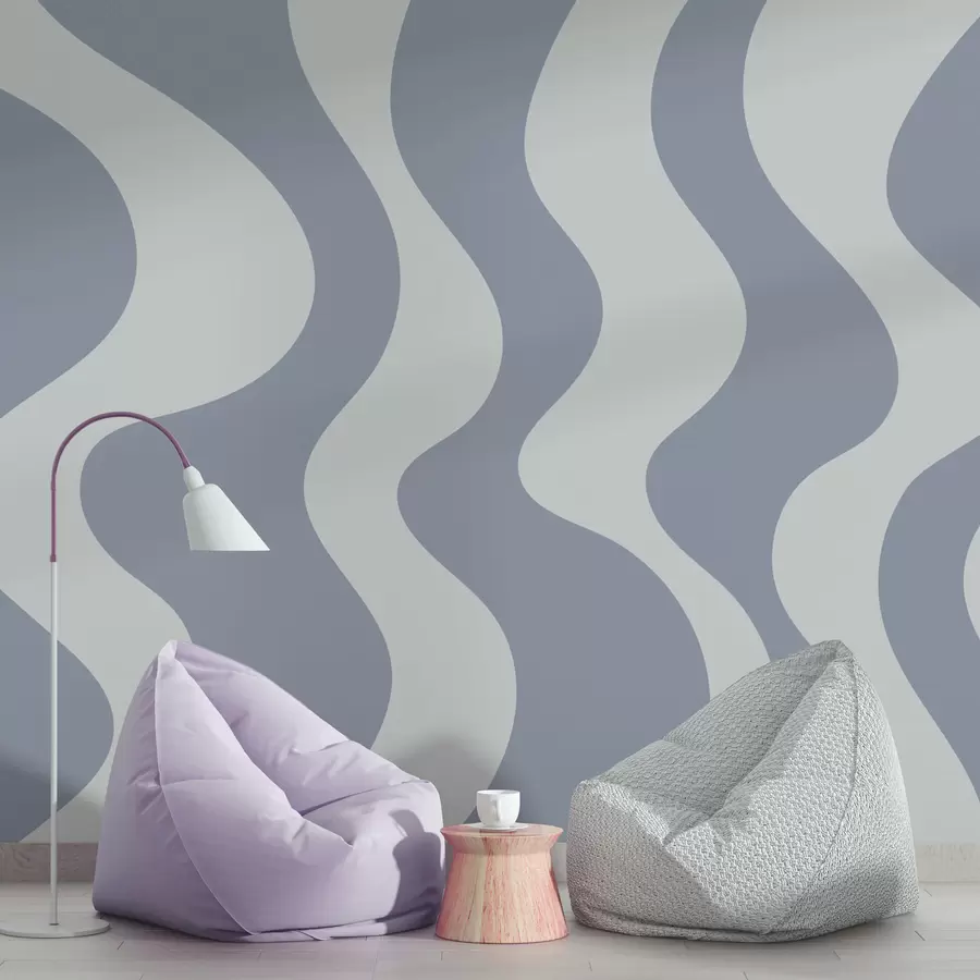 Una pared texturizada con un estampado repetido de diseños intrincados y ornamentados en tonos azules, grises y beige