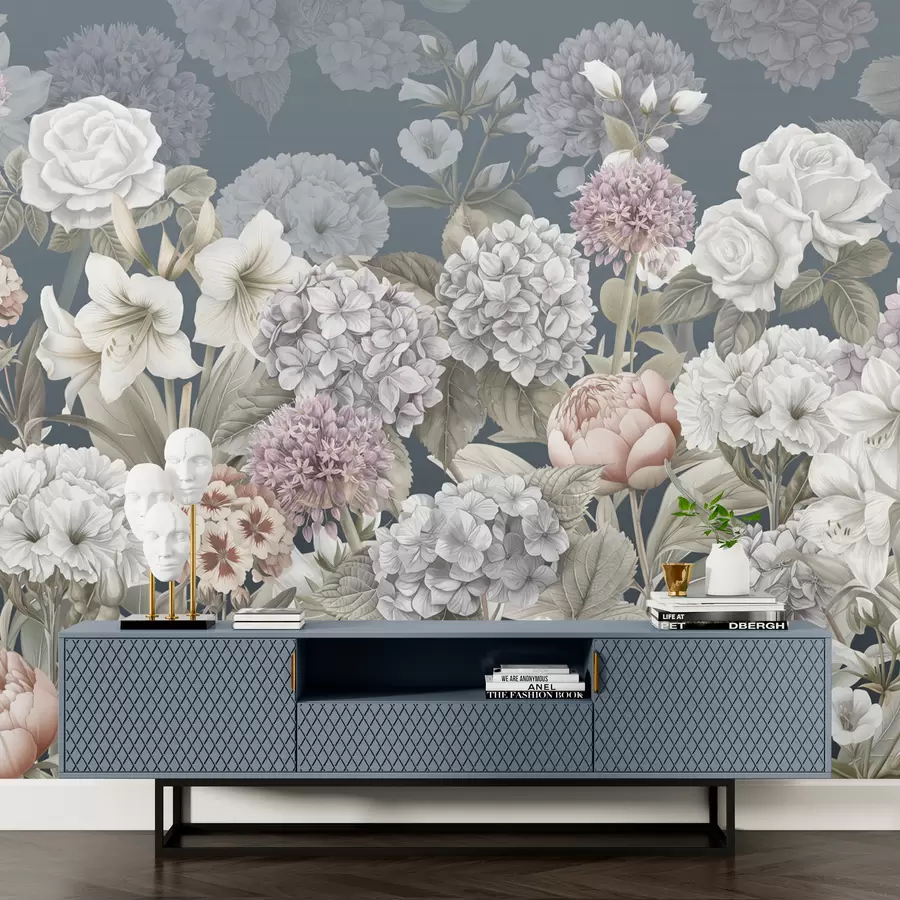 delicadas flores estilo acuarela en tonos pastel rosa, beige y azul