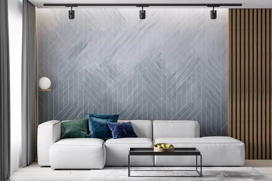 Un estampado abstracto monocromo con formas minimalistas superpuestas en tonos grises y azules.