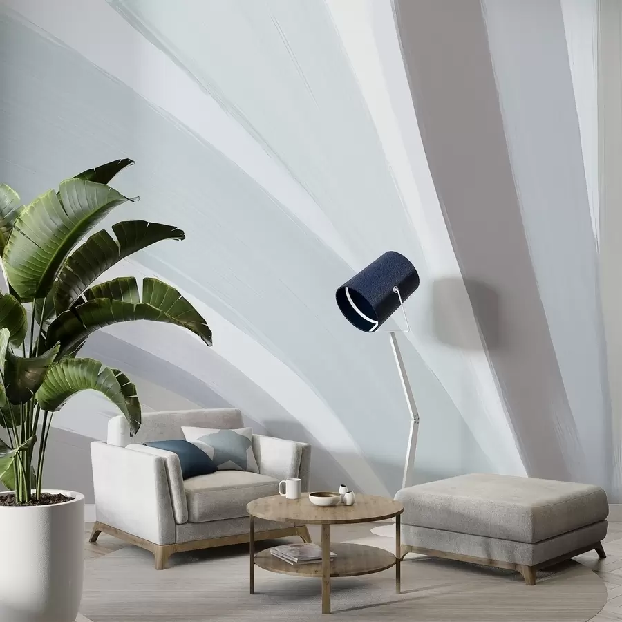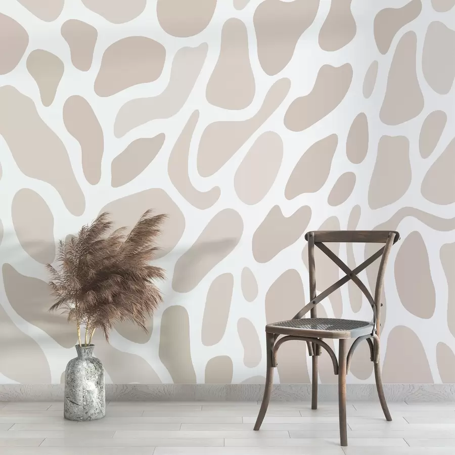 Un moderno diseño geométrico de papel pintado con formas superpuestas en suaves tonos beige, oliva y topo.