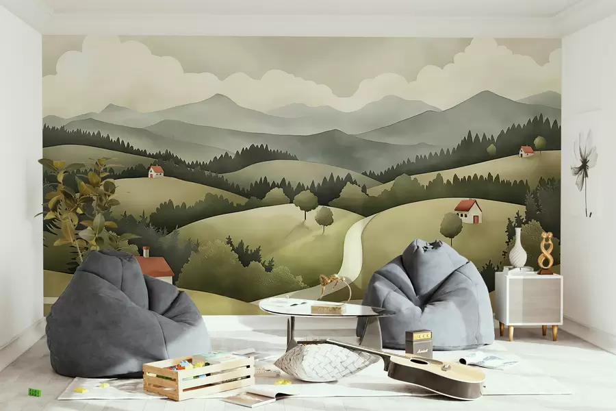 Dibujo de montañas, paisajes de naturaleza, bosque, casas de madera, color verde