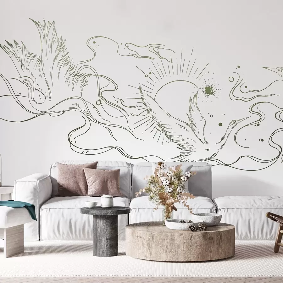 Pájaros voladores, dibujo lineal, minimalismo, paleta de colores grises