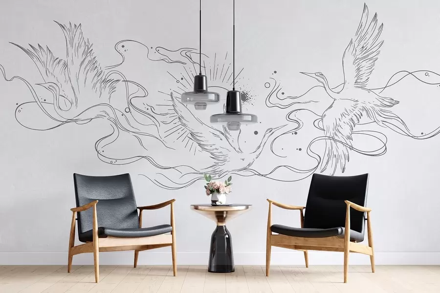 Pájaros voladores, dibujo lineal, minimalismo, paleta de colores grises