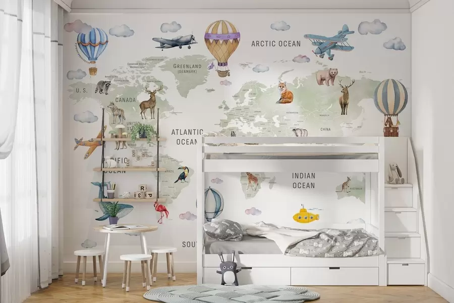 - en la habitación de los niños, puede pegar ese fotomural en las paredes, puertas, marcos de ventanas. Con su ayuda, puede decorar el interior al estilo de un viajero, donde el mapa será un elemento cognitivo colorido.