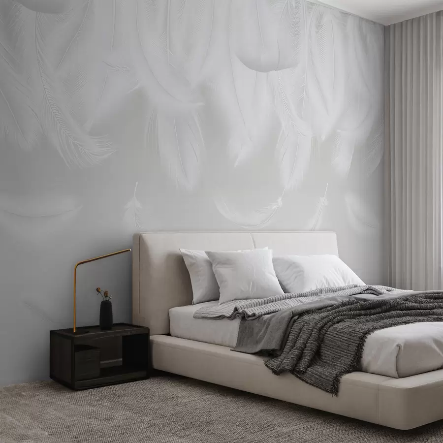Delicadas plumas blancas cayendo desde arriba sobre un fondo beige claro