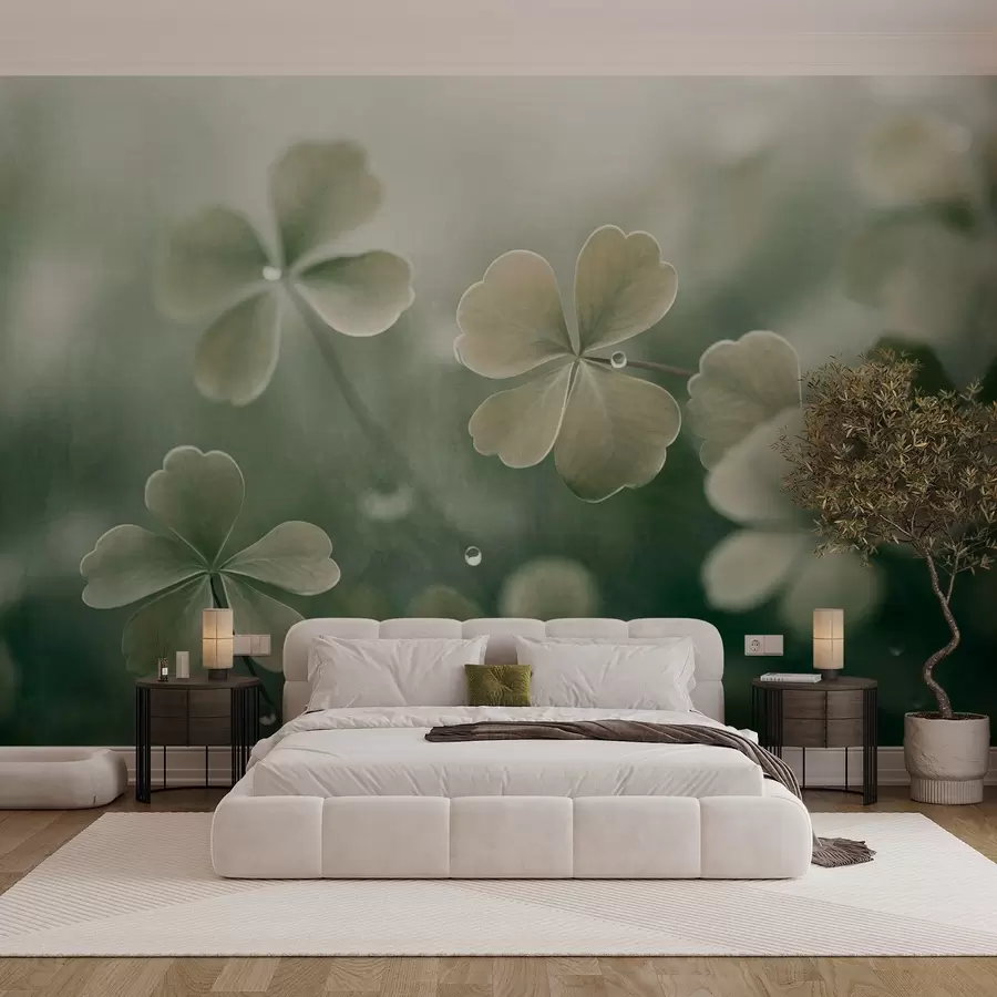 Tréboles de cuatro hojas con gotas de agua, color verde claro, enfoque suave, fondo borroso, impresión con textura