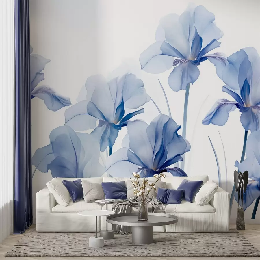 Flores de iris azules con pétalos translúcidos y tallos largos, dispuestas en fila sobre un fondo azul, suave y texturizado
