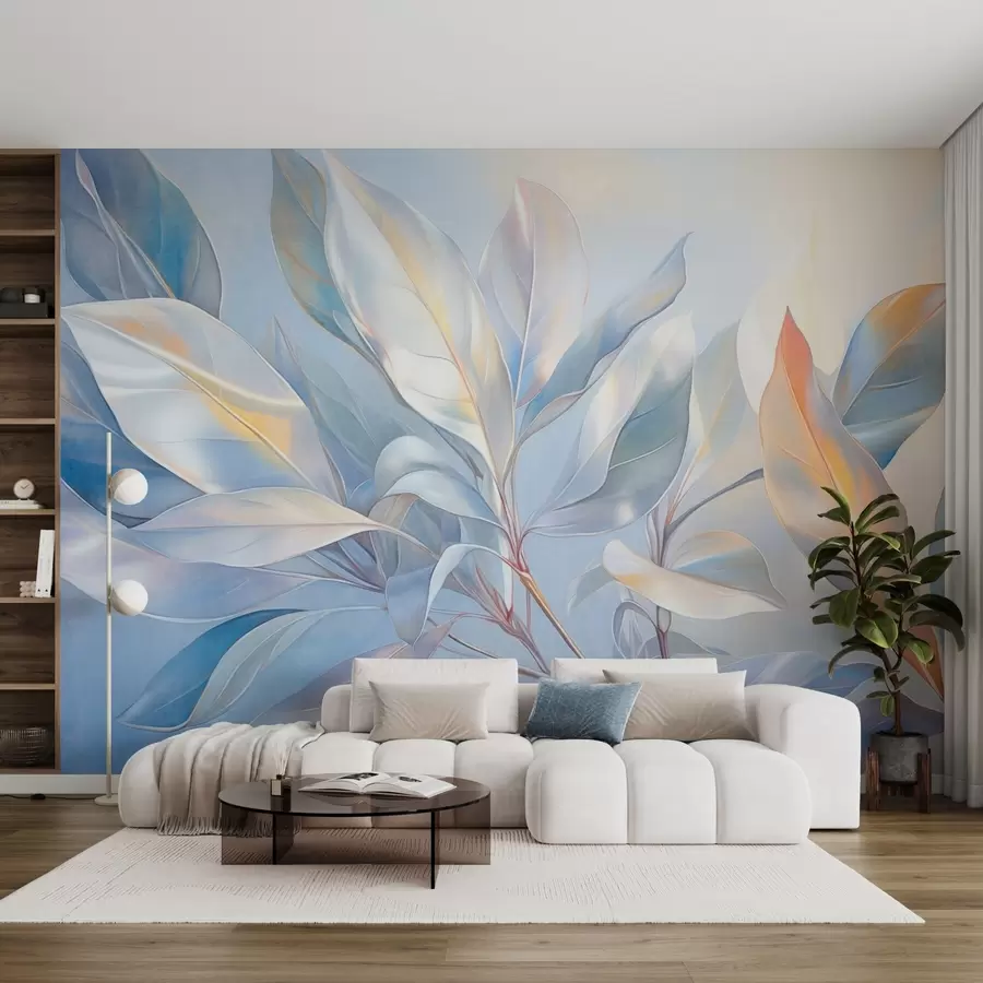 Hojas de magnolia con tonos blancos y azules, iluminación suave, composición elegante, venas de las hojas detalladas, pinceladas artísticas