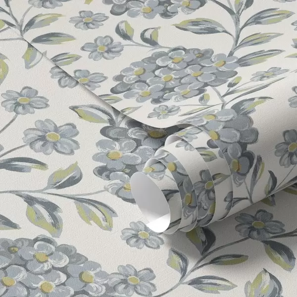 Papel pintado Flores y hojas frondosas en una paleta de colores gris azulados. a00778
