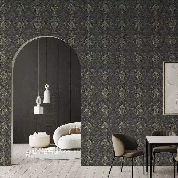Papel tapiz Damasco sobre fondo grafito oscuro, detalles en ocre oliva. Nr. a00828v5