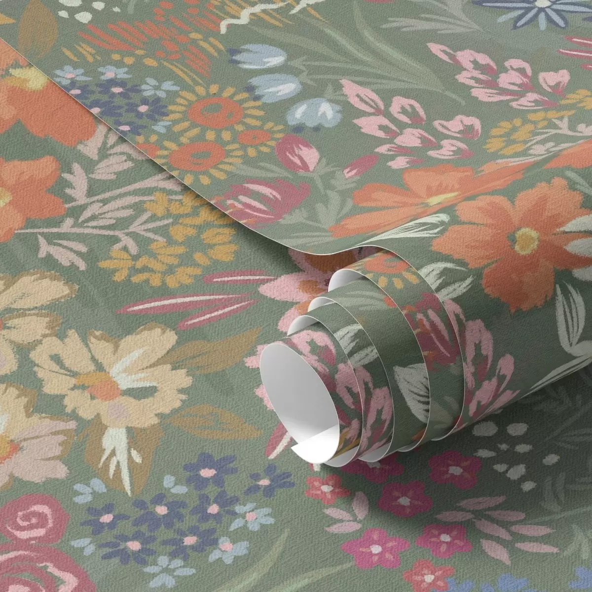 Fotomurales Flores campestres pintadas sobre fondo verde salvia Nr. a00864