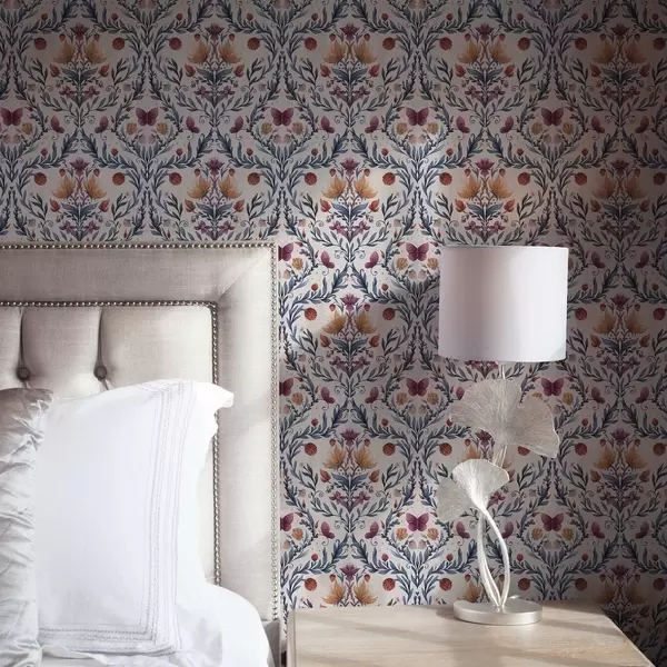 Fotomurales Damasco floral con mariposas en azul marino y terracota sobre fondo blanco. Nr. a00926v1