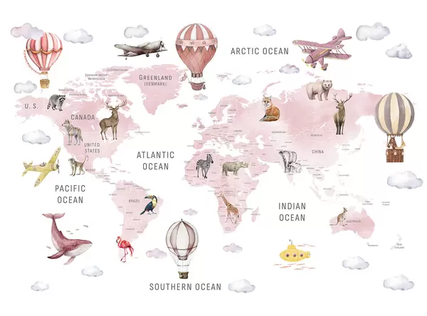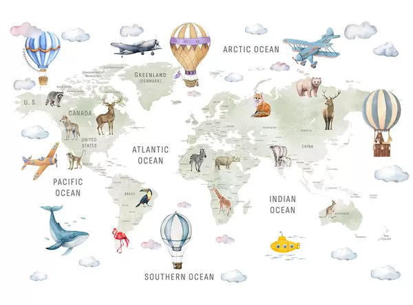 Fotomurales Mapa infantil en estilo acuarela con animales y globos aerostáticos. Idioma inglés. Color azul. Nr. c00001env1