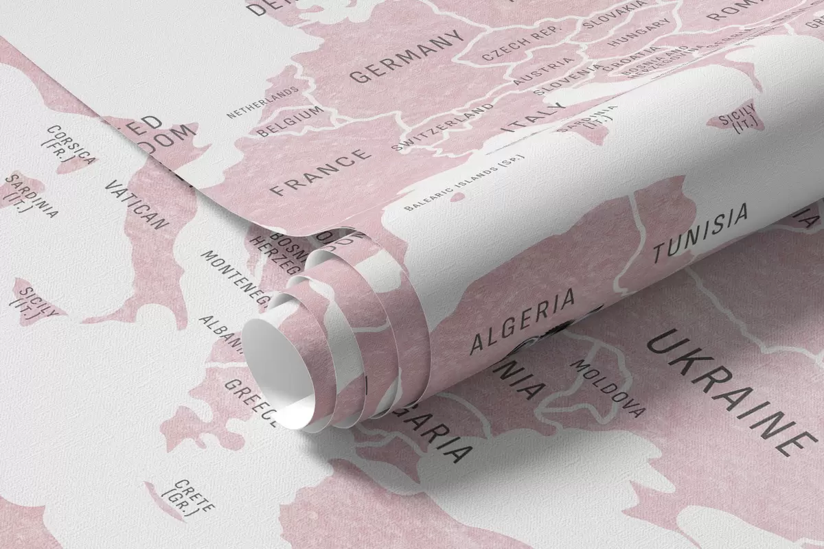 Fotomurales Mapa infantil en estilo acuarela con animales y globos aerostáticos. En inglés. Color rosa. Nr. c00001env3