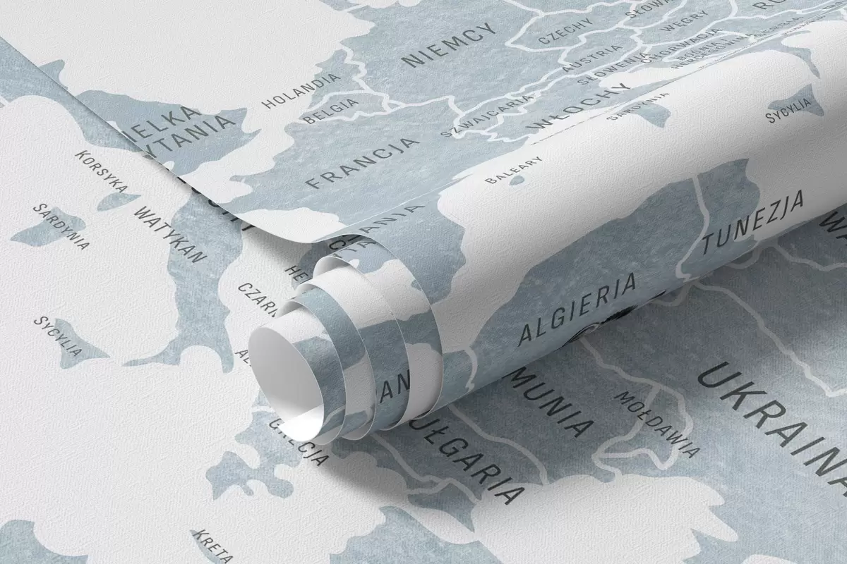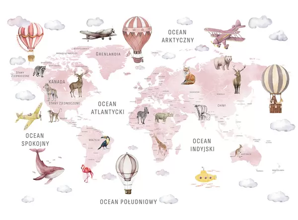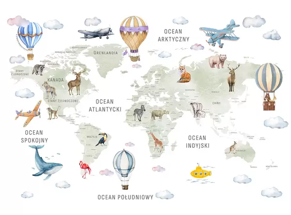 Fotomurales Mapa infantil en estilo acuarela con animales y globos aerostáticos. Idioma polaco. Color azul. Nr. c00001plv1
