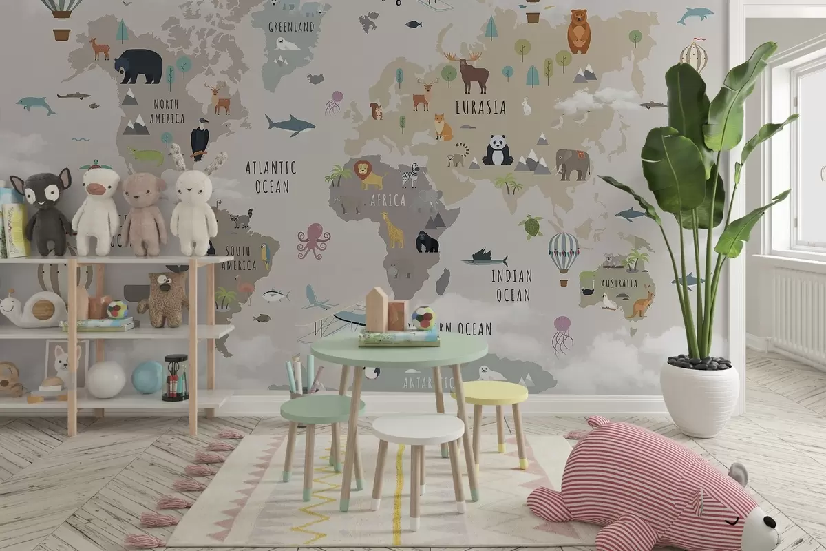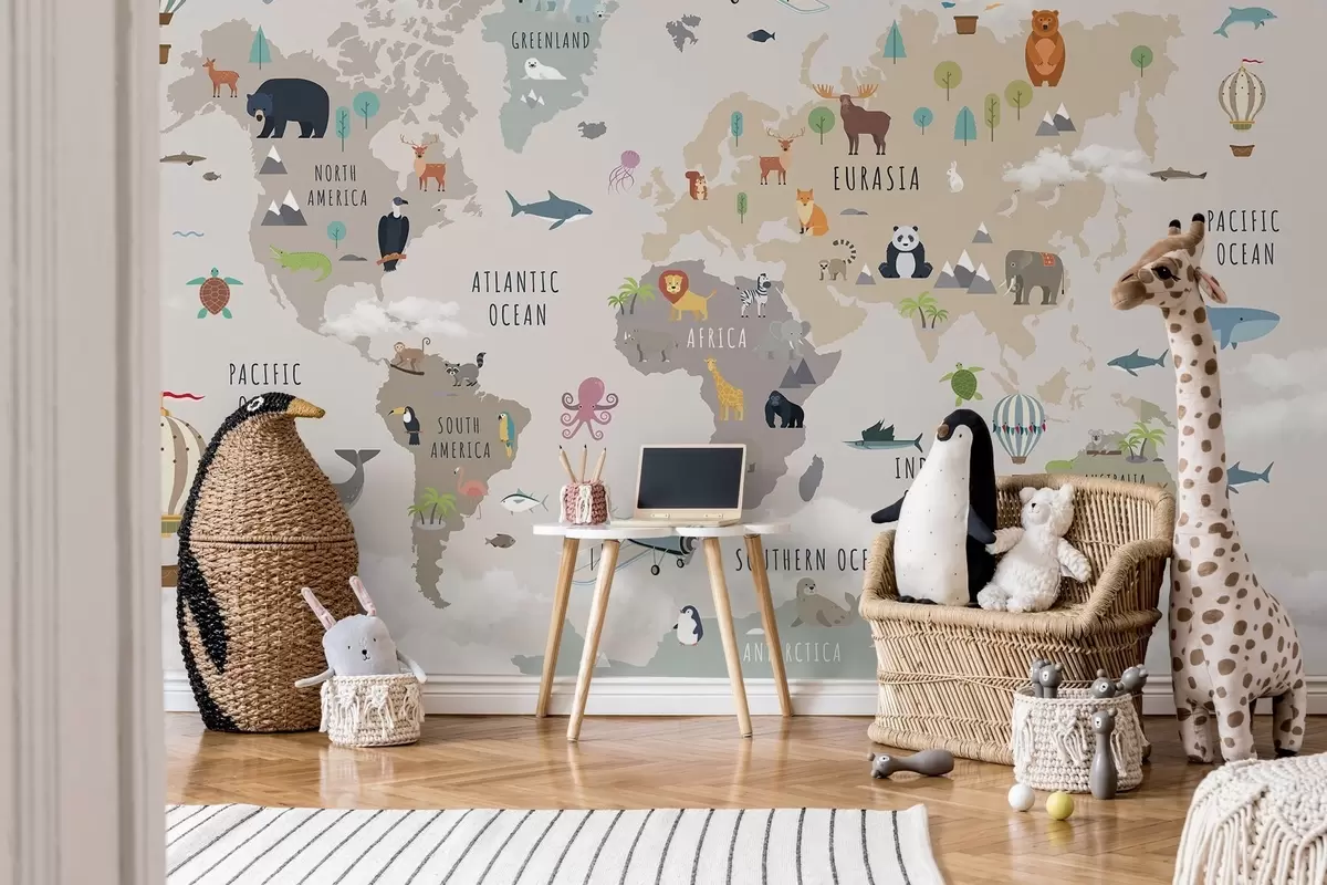 Fotomurales Mapa mundial infantil con animales y globos aerostáticos. Idioma inglés. Nr. c00002en