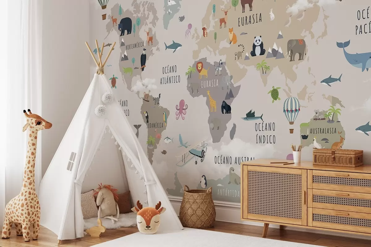 Fotomurales Mapa mundial infantil con animales y globos aerostáticos. Idioma español. Nr. c00002es