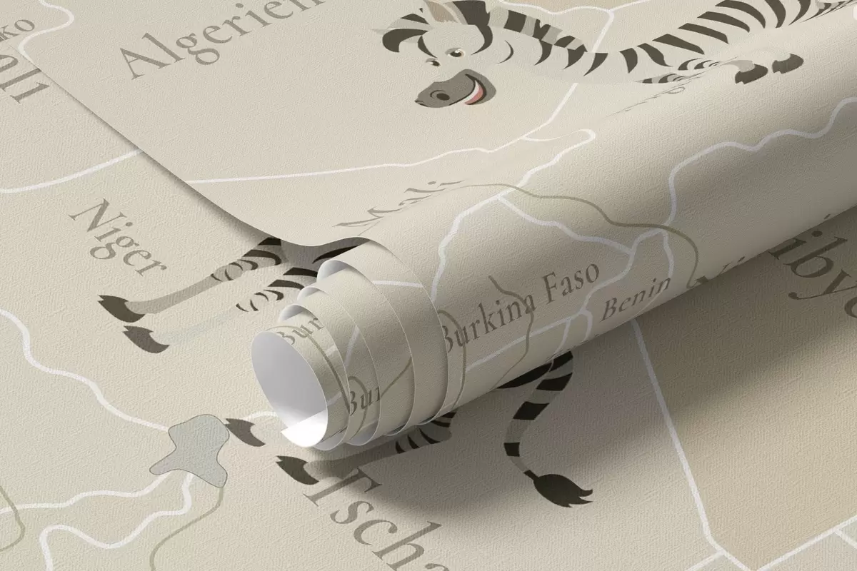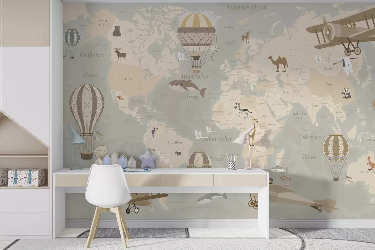 Fotomurales Mapa mundial infantil con animales, aviones y globos aerostáticos. En alemán. Color beige Nr. c00003de