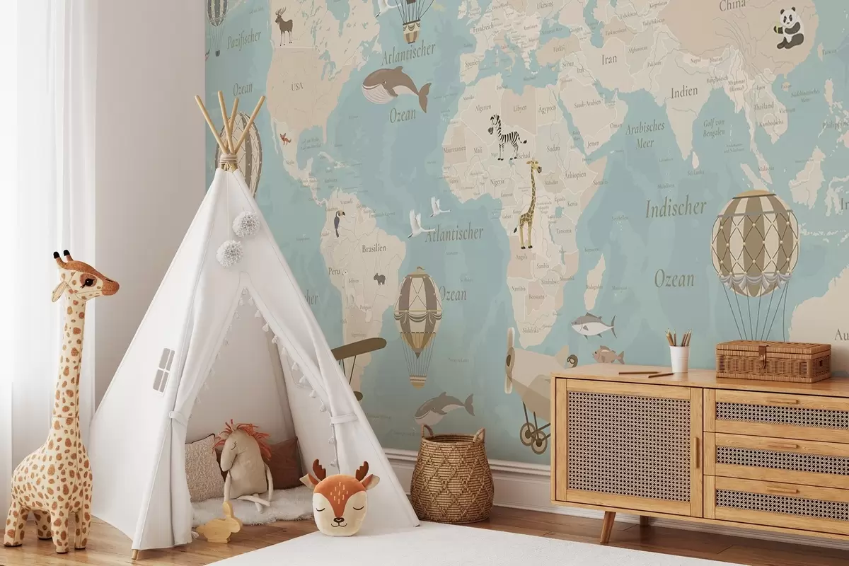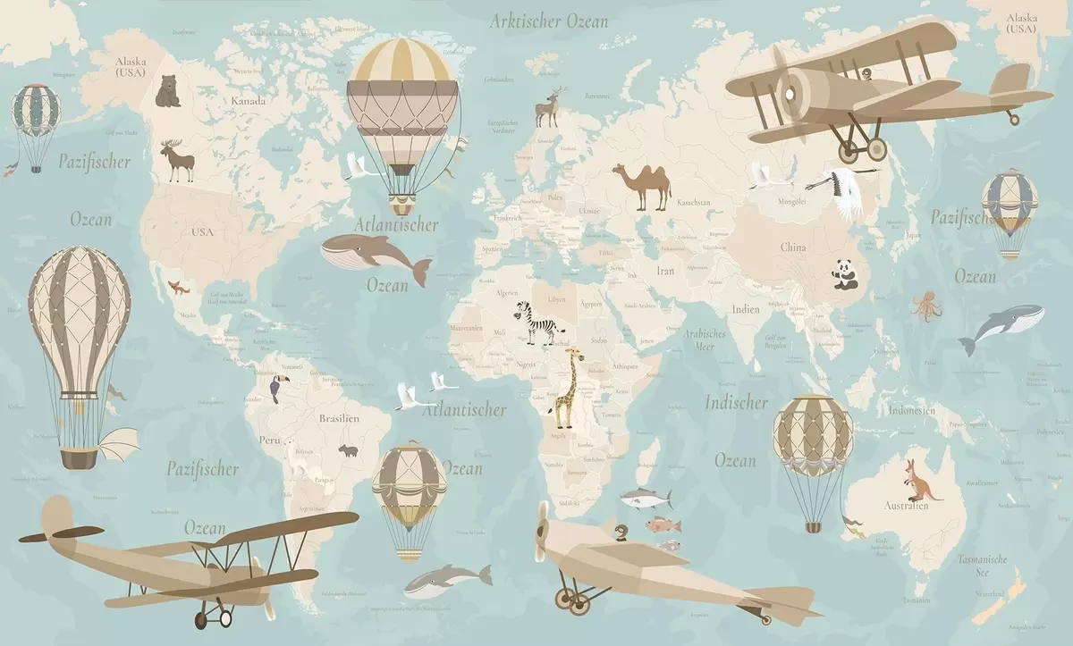 Fotomurales Mapa mundial infantil con animales, aviones y globos aerostáticos. En alemán. Color azul. Nr. c00003dev1