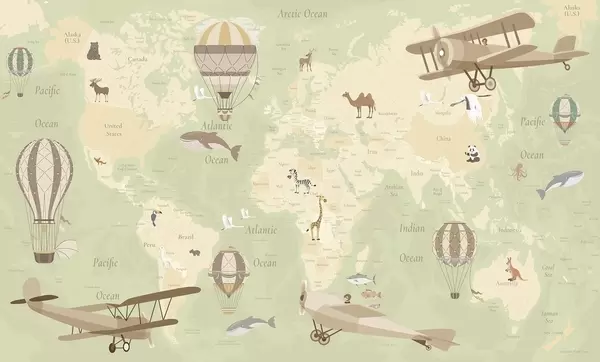 Fotomurales Mapa mundial infantil con animales, aviones y globos aerostáticos. En inglés. Color beige. Nr. c00003en