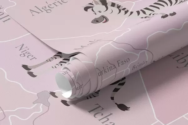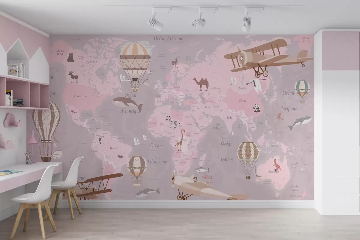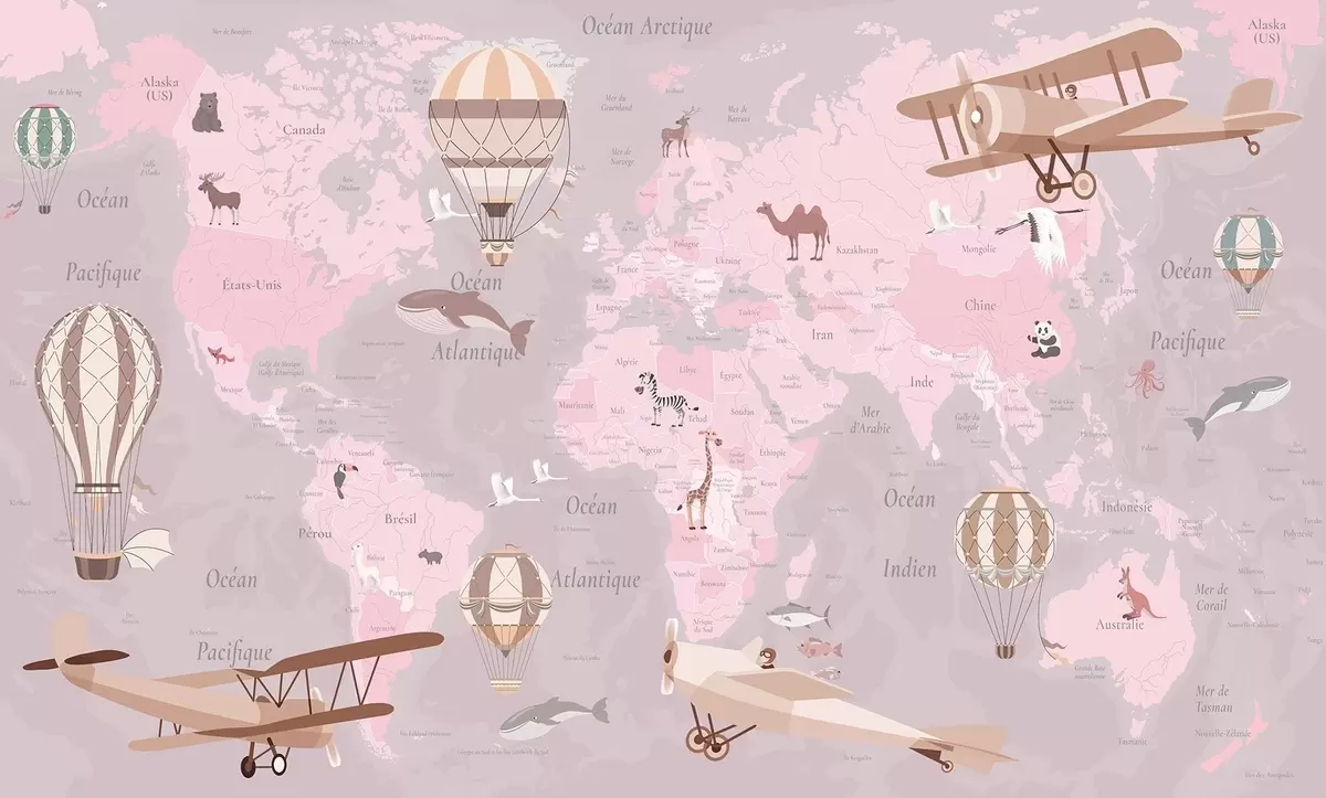 Fotomurales Mapa mundial infantil con animales, aviones y globos aerostáticos. Idioma francés. Color rosa. Nr. c00003frv3