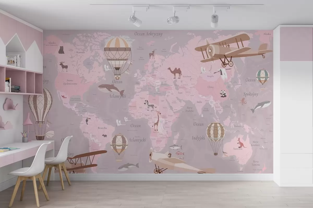 Fotomurales Mapa mundial infantil con animales, aviones y globos aerostáticos. Idioma polaco. Color rosa. Nr. c00003plv3