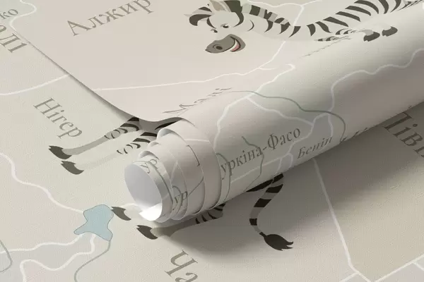 Fotomurales Mapa mundial infantil con animales, aviones y globos aerostáticos. Idioma ucraniano. Color azul. Nr. c00003ukv1