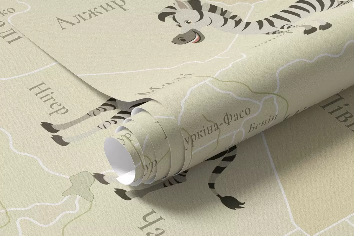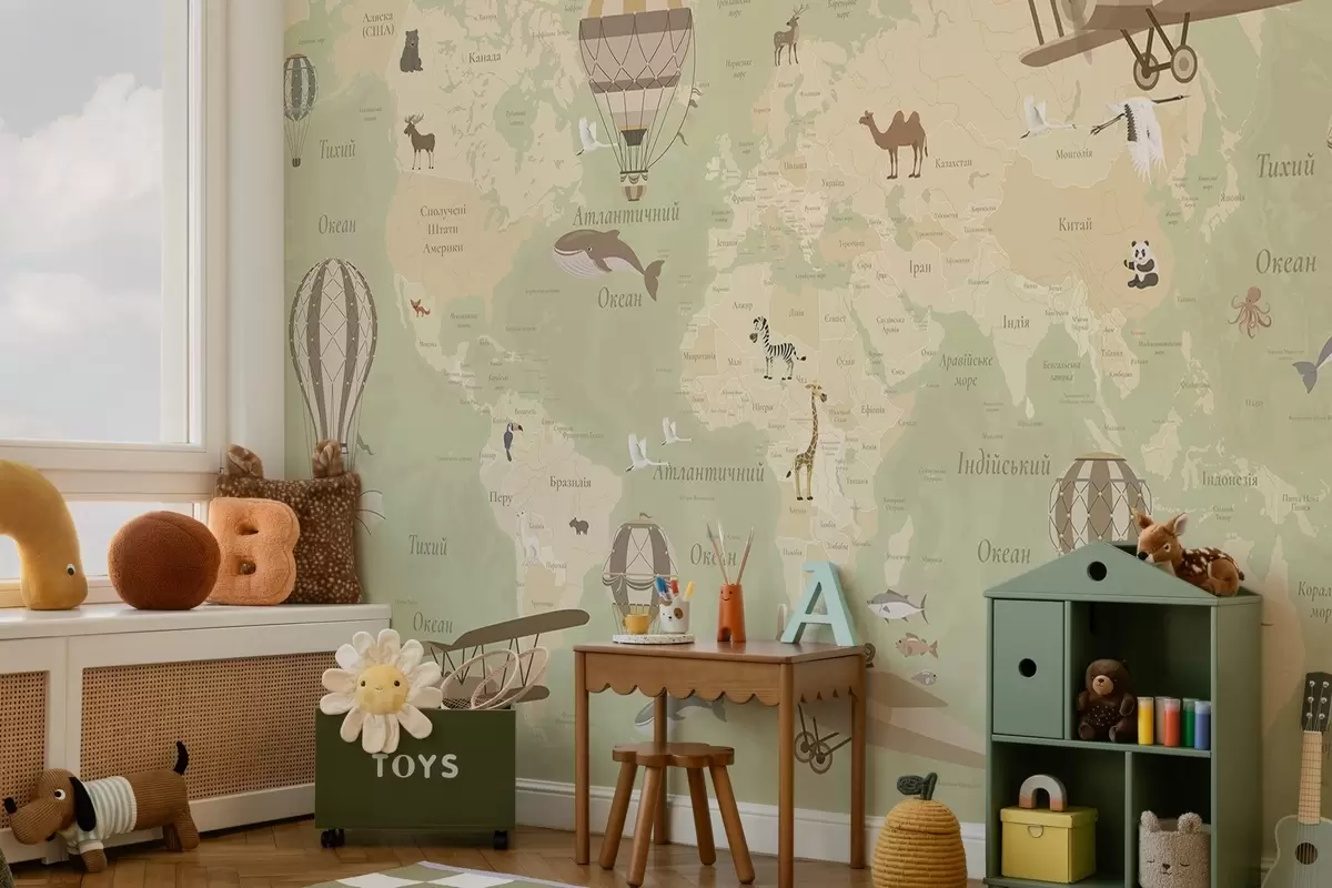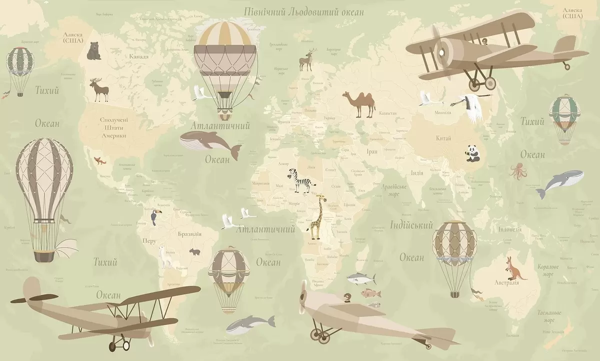 Fotomurales Mapa mundial infantil con animales, aviones y globos aerostáticos. Idioma ucraniano. Color verde. Nr. c00003ukv2