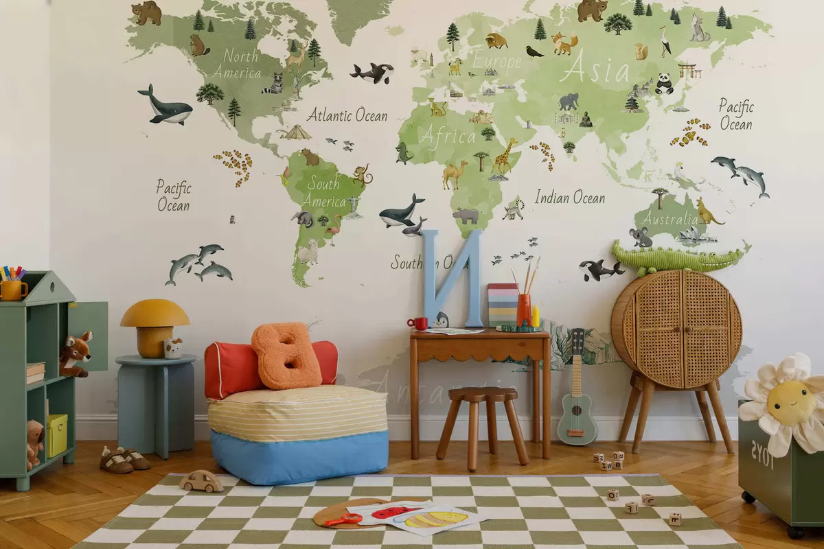 Fotomurales Un mapa de Green en estilo acuarela con animales, plantas y arquitectura. Etiquetas en inglés Nr. c00009env2