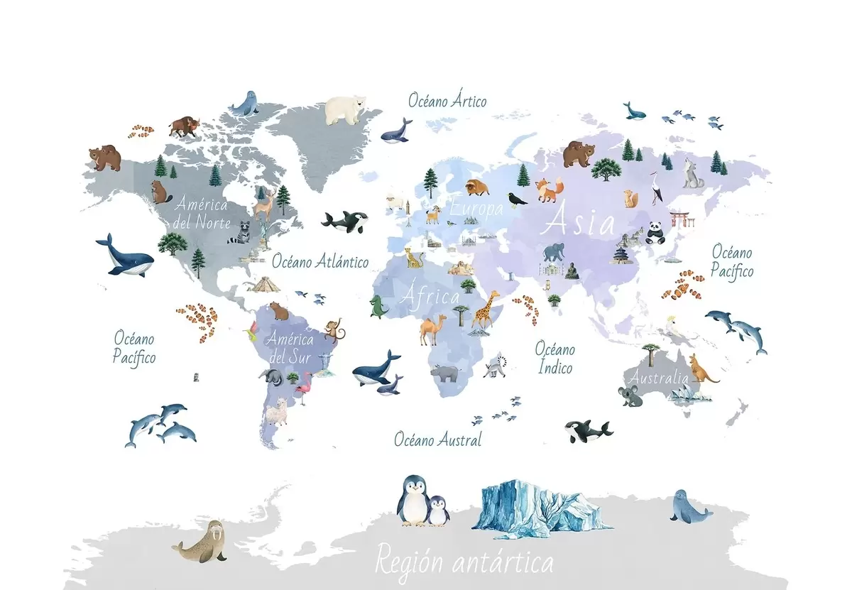Fotomurales Un mapa azul de estilo acuarela en el que aparecen animales, plantas y elementos arquitectónicos. Etiquetas en español Nr. c00009esv1