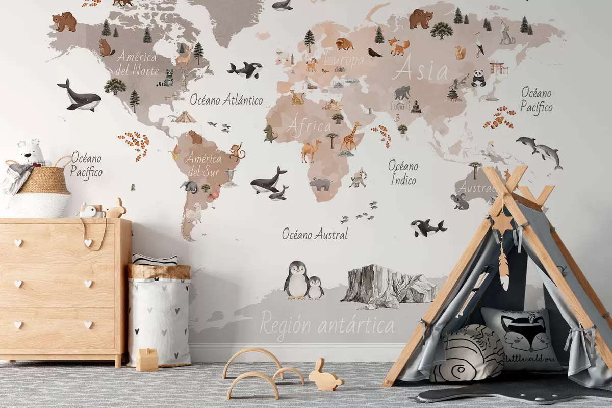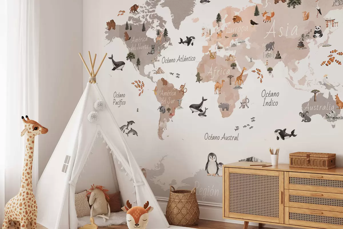 Fotomurales Un mapa en tonos beige, con un estilo de acuarela, en el que aparecen animales, plantas y elementos arquitectónicos. Rótulos en español Nr. c00009esv3
