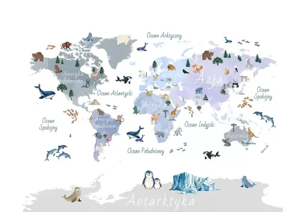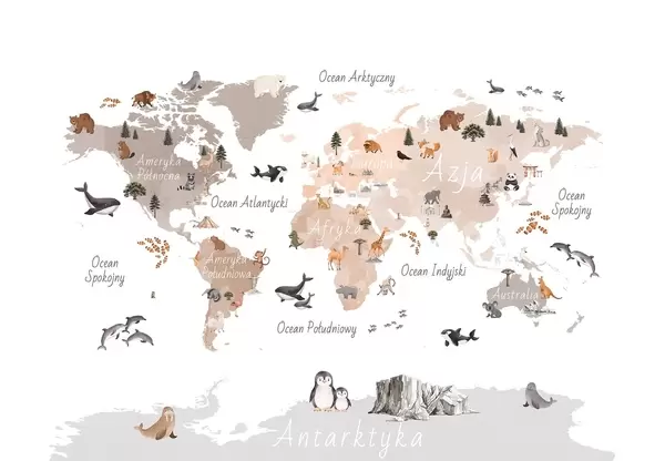 Fotomurales Un mapa a color con estilo de acuarela en el que aparecen animales, plantas y elementos arquitectónicos. Rótulos en polaco Nr. c00009pl