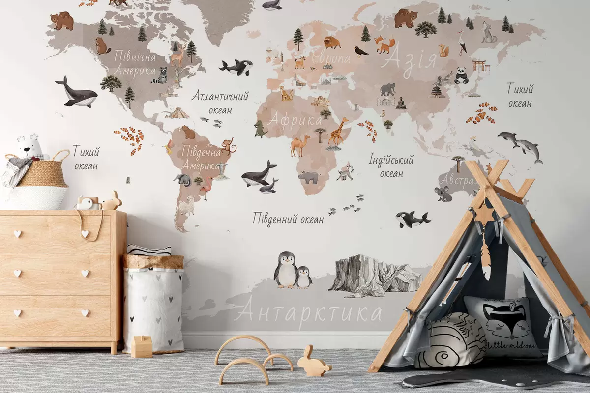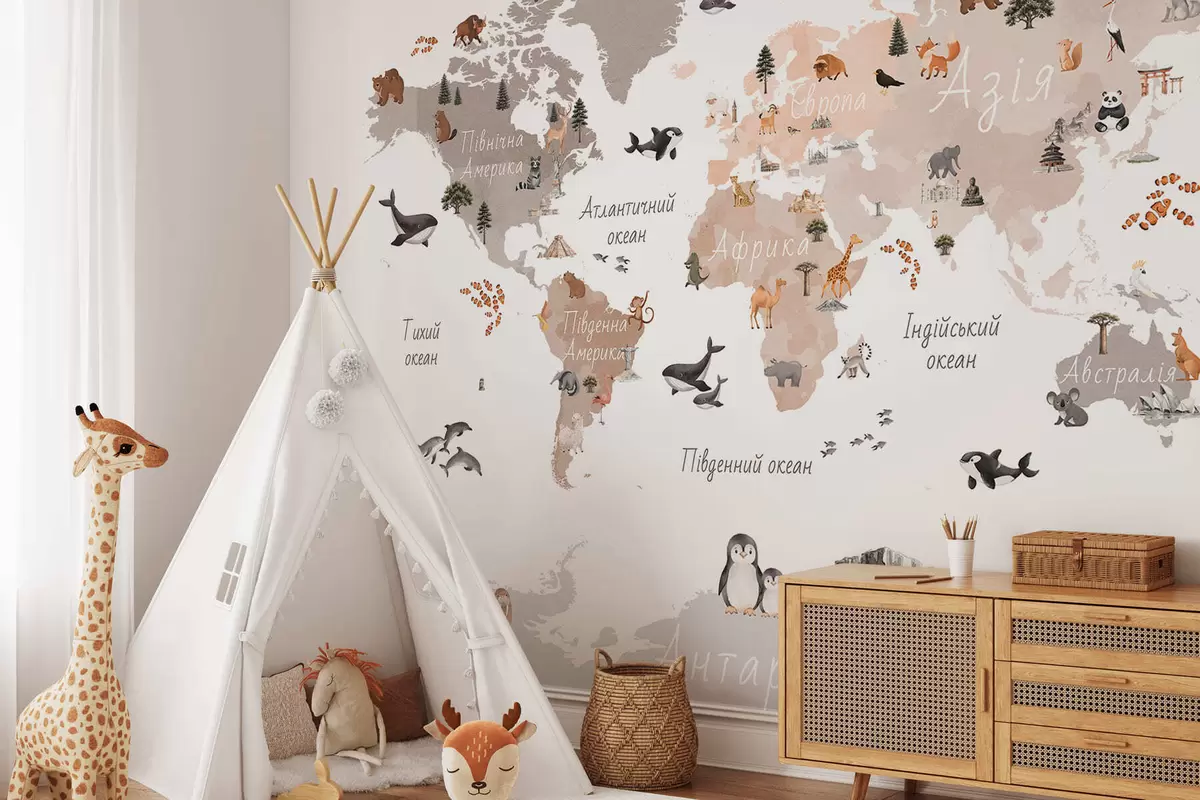 Fotomurales Un mapa en tonos beige, con un estilo de acuarela, en el que aparecen animales, plantas y elementos arquitectónicos. Rótulos en ucraniano. Nr. c00009ukv3