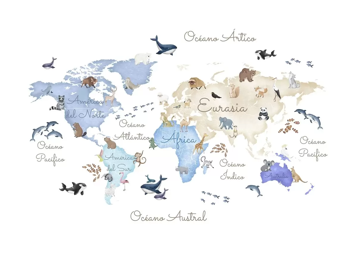 Fotomurales Un mapa azul con estilo de acuarela en el que aparecen animales. Etiquetas en español Nr. c00012esv1