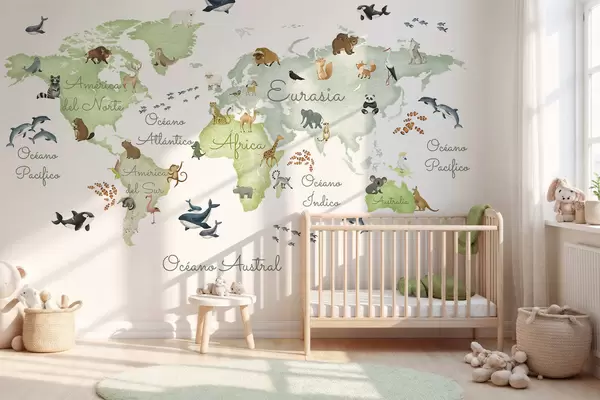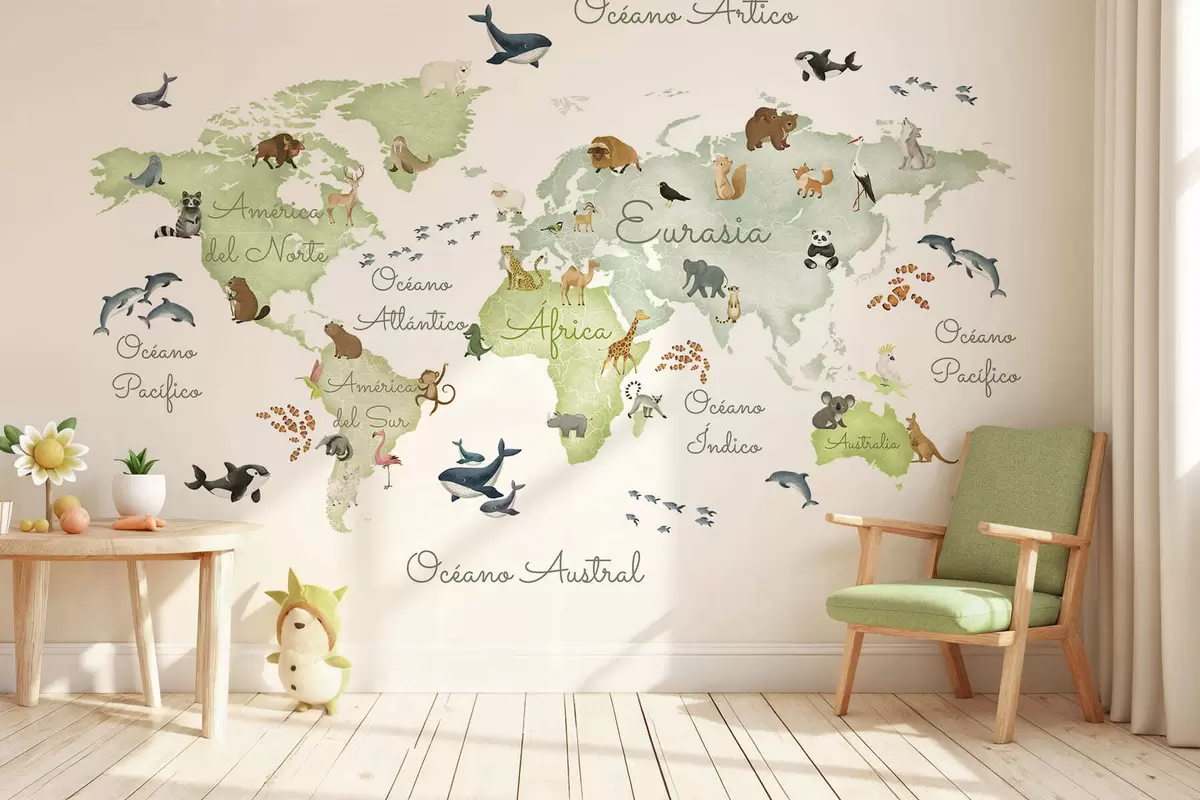 Fotomurales Un mapa verde con estilo de acuarela en el que aparecen animales. Etiquetas en español Nr. c00012esv2