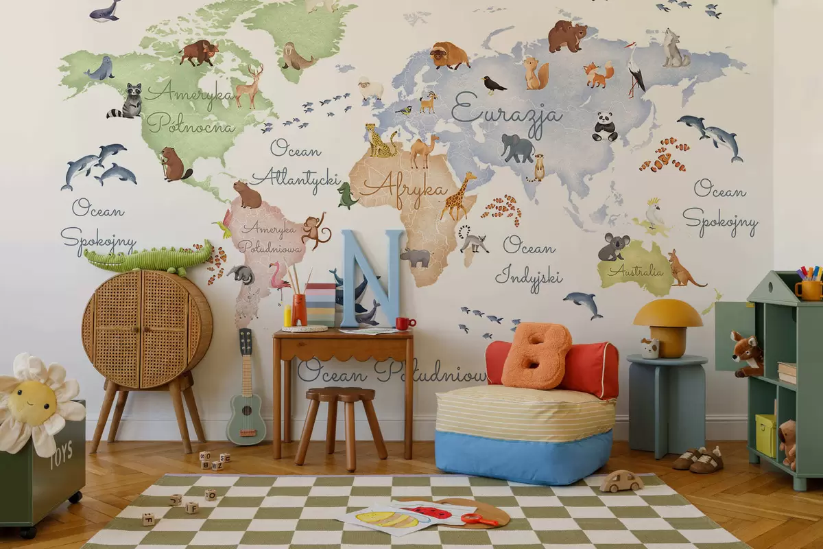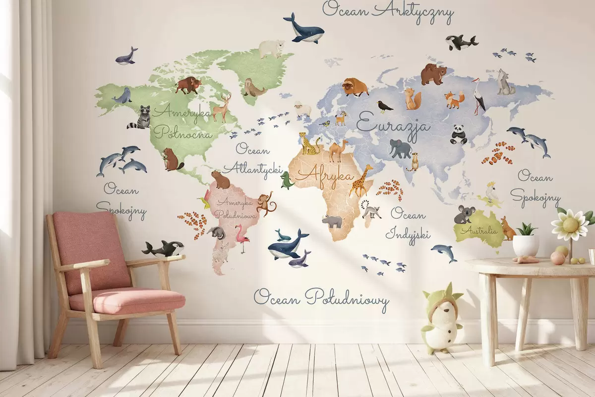 Fotomurales Un mapa a color con estilo de acuarela en el que aparecen animales. Etiquetas en polaco Nr. c00012pl