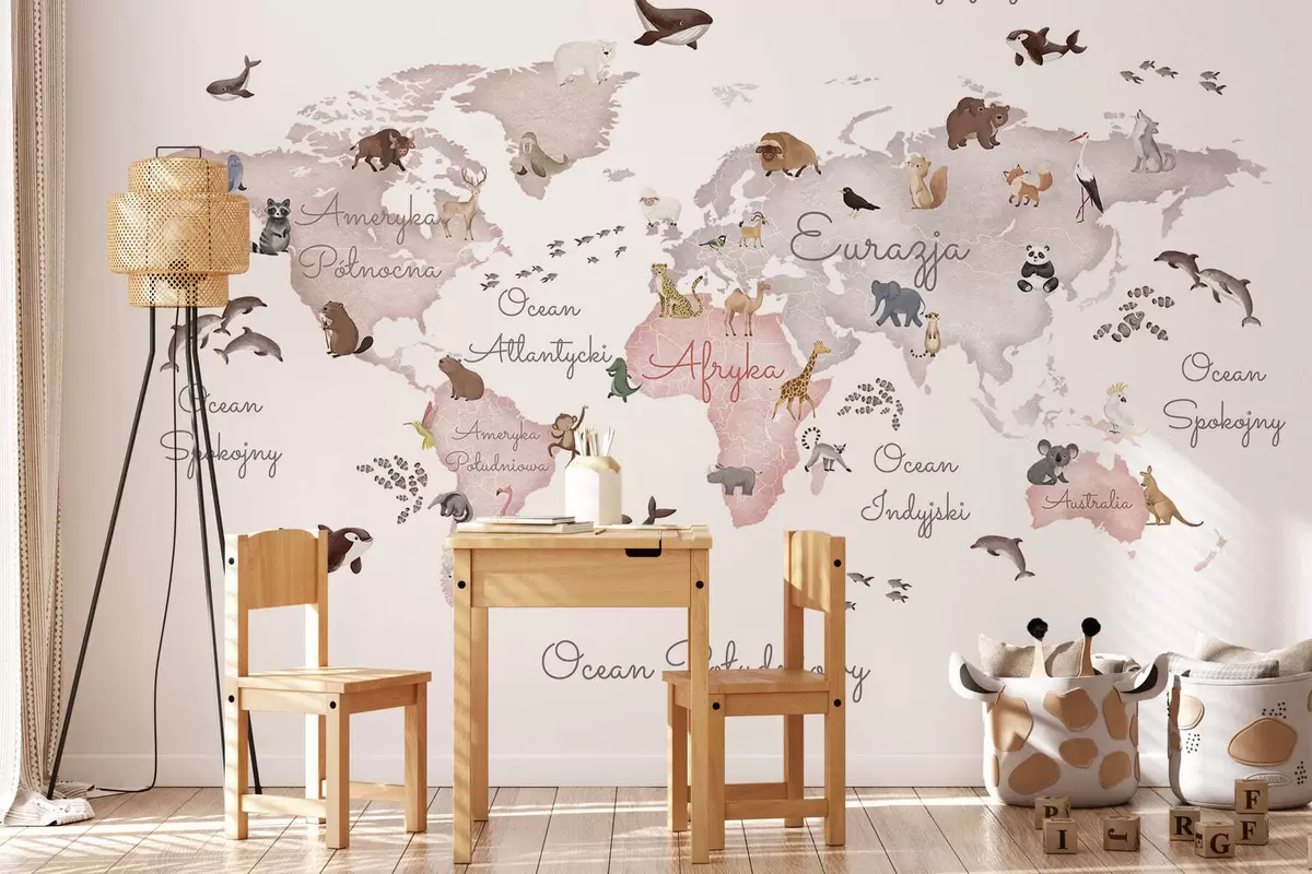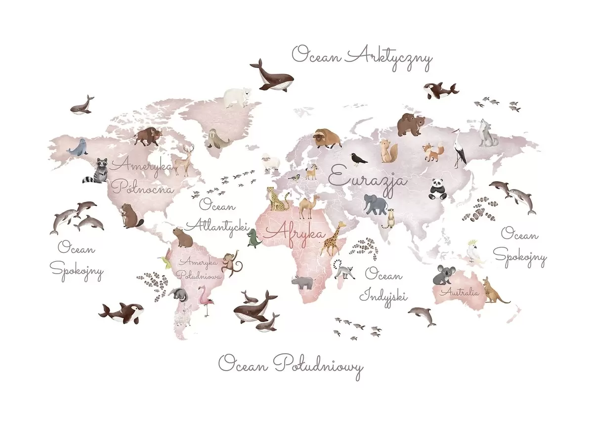 Fotomurales Un mapa en tonos beige, con un estilo de acuarela, en el que aparecen animales. Rótulos en polaco Nr. c00012plv3