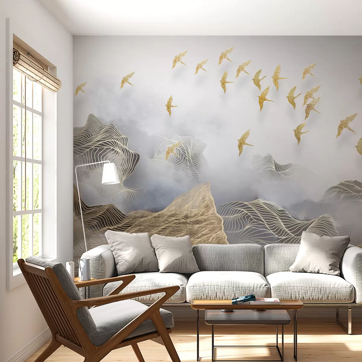 Fotomurales Un maravilloso paisaje con montañas y pájaros se dibuja a partir de finas líneas Nr. u44870