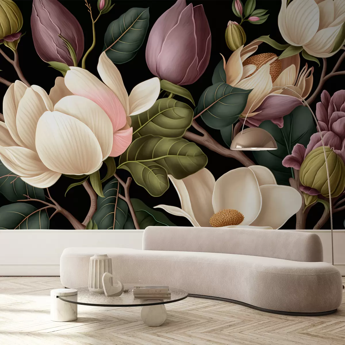 murales de pared Ramo de flores en una rama de árbol sobre un fondo negro u74756