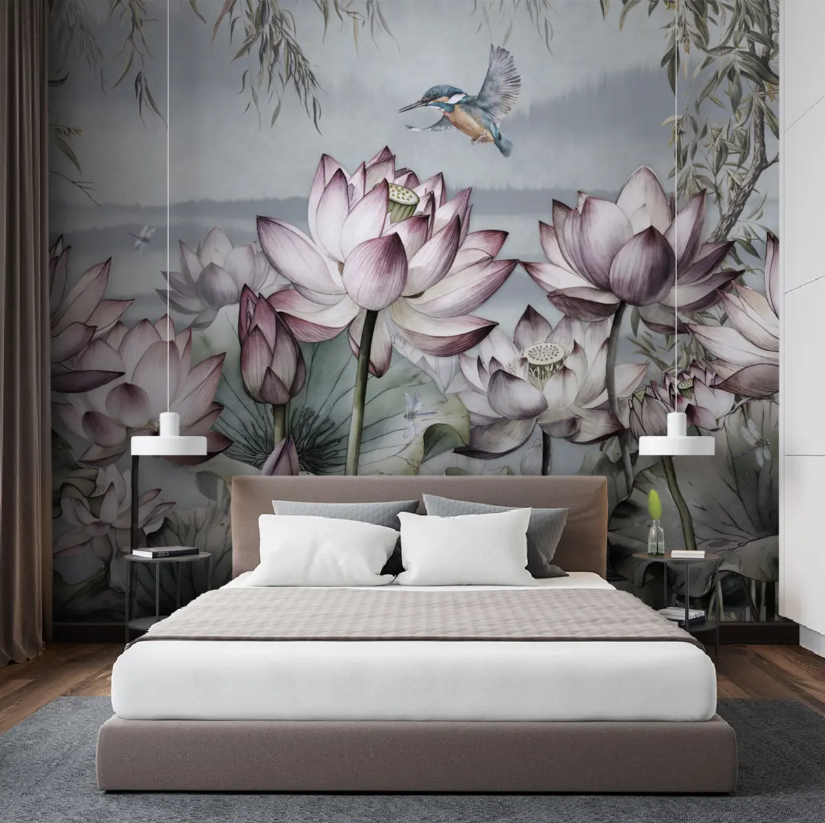 Fotomurales Flor de loto del paisaje con martín pescador Nr. u95397