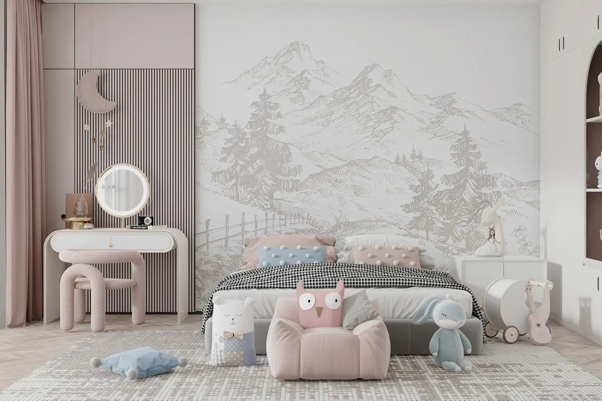 Fotomurales Paisaje de montaña, dibujo lineal, árboles, minimalismo, colores beige Nr. u99572