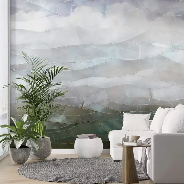 Fotomurales Paisaje texturizado de gradiente abstracto, montañoso y brumoso con campos verdes ondulados a través de la niebla Nr. w00795