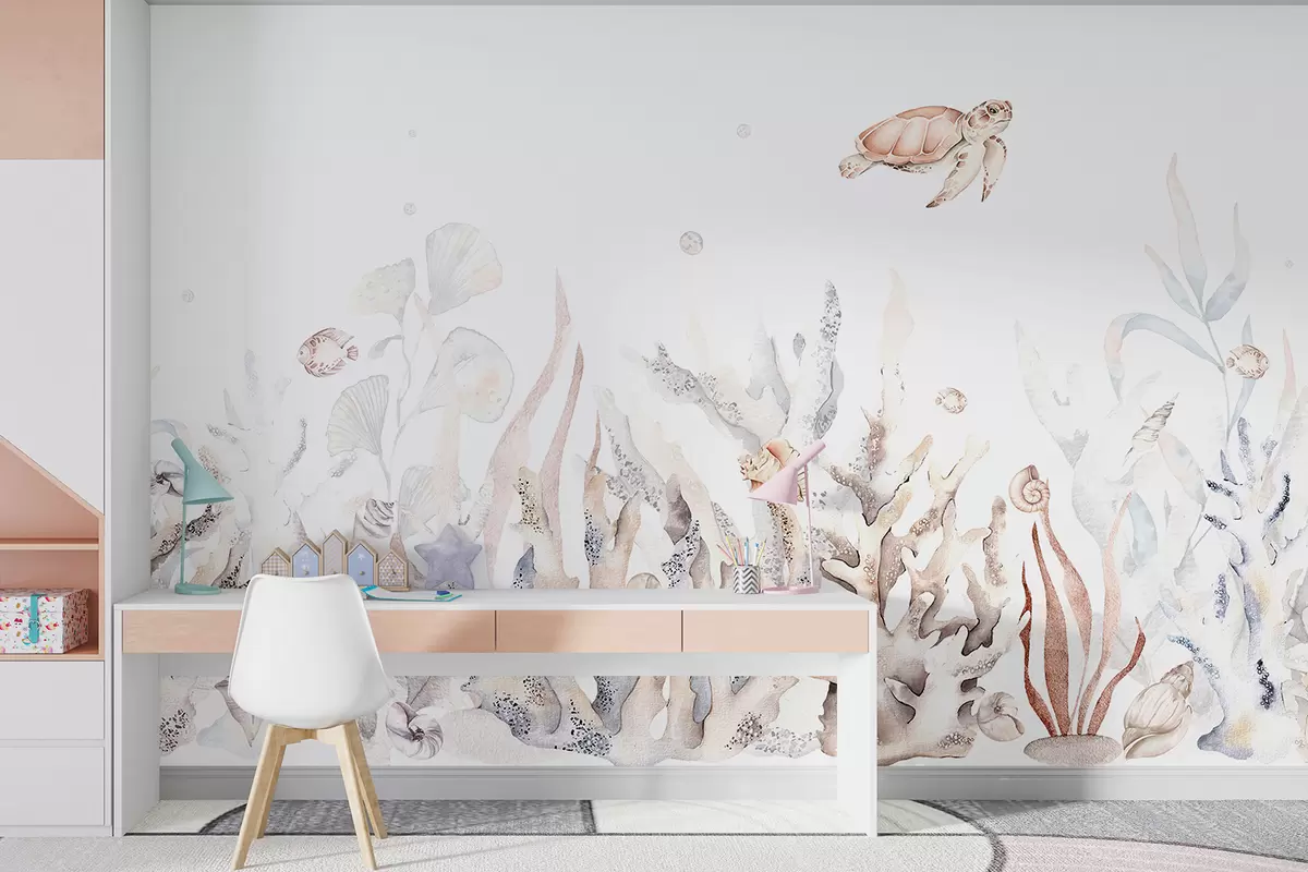 Fotomurales Corales marinos acuarela, conchas marinas, tortugas, vida marina, colores beige suaves Nr. w00849v1