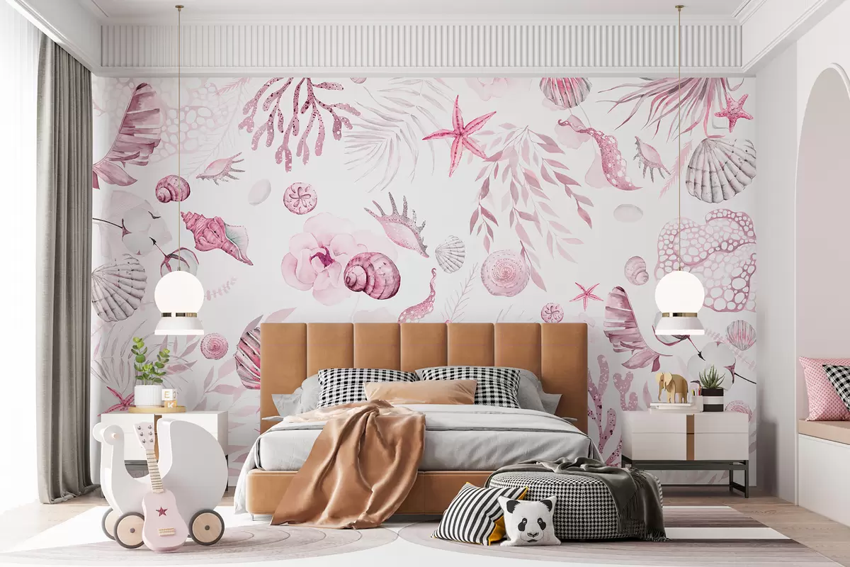 Fotomurales Patrón marino acuarela, estilo boho, conchas marinas, corales, algodón, colores rosados Nr. w00851v3