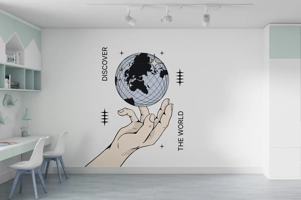 Fotomurales Mano beige girando el globo sobre un fondo blanco para la decoración de la habitación o la oficina Nr. w00984